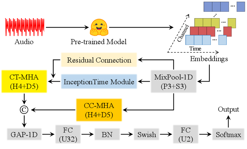 為應(yīng)對(duì)上述挑戰(zhàn),研究團(tuán)隊(duì)提出了一種跨時(shí)間與跨通道的多變量時(shí)間序列處理框架(CTCAIT)。該框架首先利用大型音頻模型提取語音信號(hào)的高維時(shí)序特征,并將其表示為時(shí)間與通道的多維嵌入結(jié)構(gòu)。隨后,借助 InceptionTime 網(wǎng)絡(luò)提取多變量時(shí)間序列中的多尺度、多層次信息,結(jié)合跨時(shí)間與跨通道的多頭注意力機(jī)制,有效捕捉語音在不同維度中所蘊(yùn)含的病理特征。該方法在中文普通話語音數(shù)據(jù)集上達(dá)到了92.06%的檢測(cè)準(zhǔn)確率,在外部英文數(shù)據(jù)集上也取得了87.73%的準(zhǔn)確率,表現(xiàn)出良好的跨語言泛化能力。
