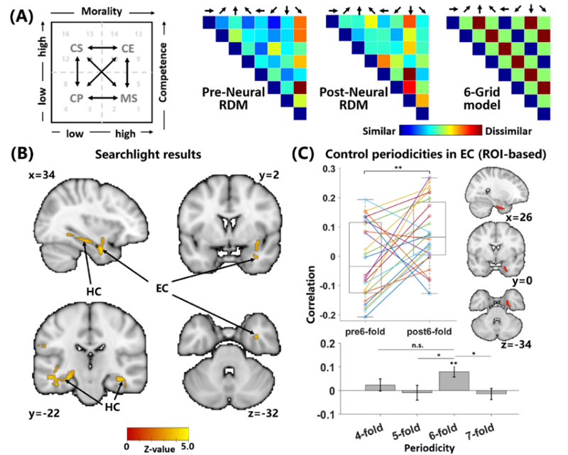 研究結果提供了行為與神經層面的雙重證據:行為層面,當兩個人之間的社會等級差距越大,受試者做出判斷的速度越快、準確率也越高。這表明,人們在進行社會判斷時,依賴的是一張內在的“地圖”,而非逐一回憶孤立的信息。神經層面,成像結果精準定位了這張“地圖”的繪制者——大腦中負責空間記憶與導航的海馬體-內嗅皮層系統。分析顯示,海馬體的核心功能是編碼個體間的相對“社交距離”;而內嗅皮層則更進一步,以一種獨特的六邊形網格模式進行編碼,為這張抽象地圖提供了方向和結構,類似于物理地圖上的坐標網格。