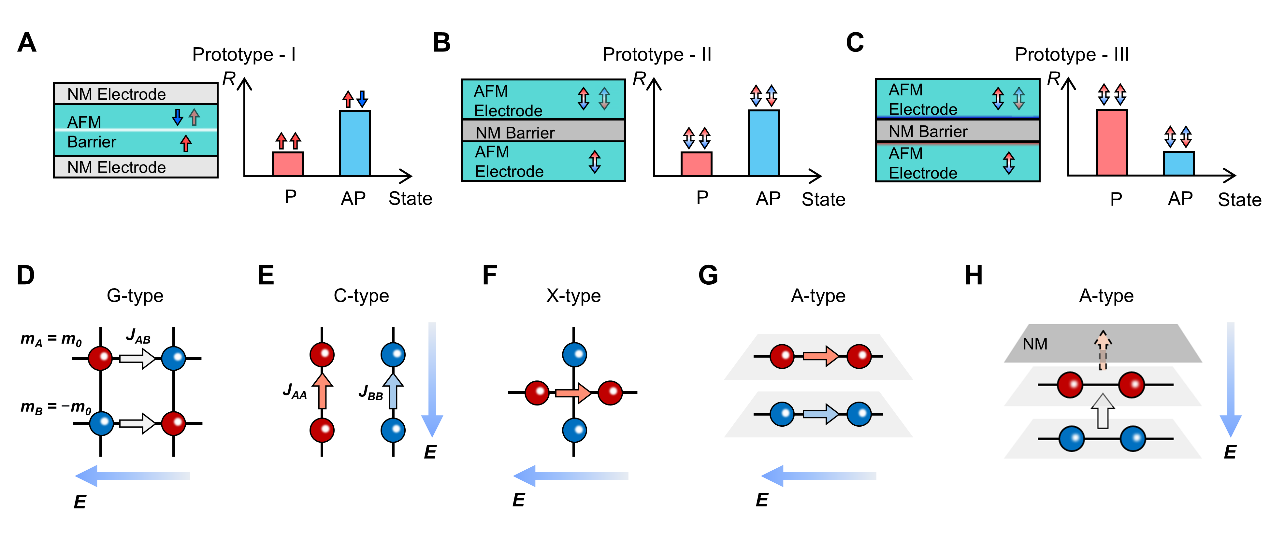 圖1. (A-C) 反鐵磁隧道結的三種基本類型;(D-G) 不同反鐵磁結構允許的自旋極化輸運特性(體效應);(H) A型反鐵磁體未補償的界面磁矩支持具有宏觀自旋極化的隧穿電流。